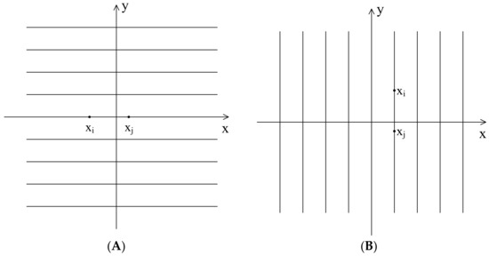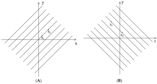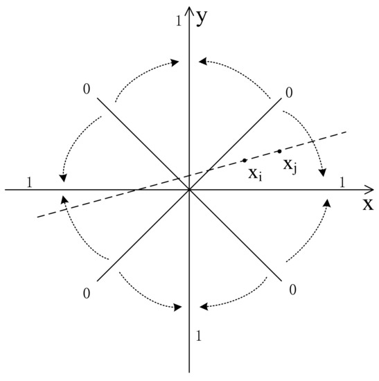 From Equation (9), when the two vectors and are on the lines as shown in Figure 4 (at an angle of 45 degrees to x-axis, y = x + a or y = −x + a, where a is a constant), will be 0. When the two vectors and are on the lines as shown in Figure 5 (on or parallel to the x-axis or y-axis, y = a or x = a, where a is a constant), then will be 1. Figure 6 shows the trend of vector distance with the change of vector angle, i.e., when vector angle changes from 45 degrees to 0 degrees with the x-axis or y-axis, the vector distance changes from 0 to 1.