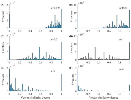 Vector similarity degrees histogram of the N rhythm. (A) n = 0.125; (B) n = 0.25; (C) n = 0.5; (D) n = 1; (E) n = 2 and (F) n =4.