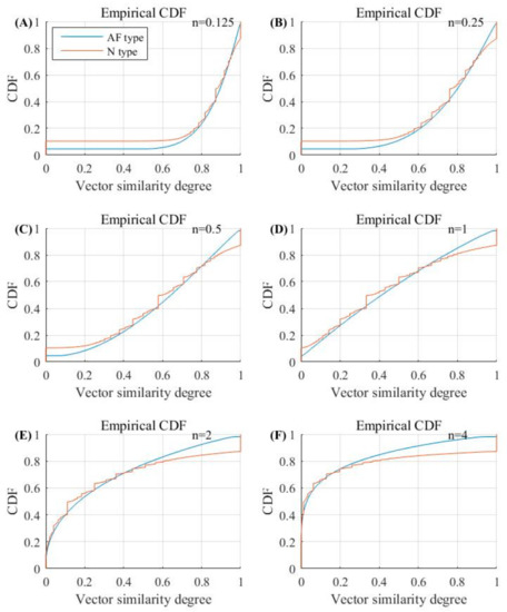 Cumulative distribution function (CDF) for vector similarity degrees. (A) n = 0.125; (B) n = 0.25; (C) n = 0.5; (D) n = 1; (E) n = 2 and (F) n =4.