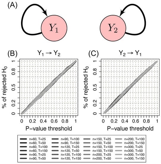 First, it is possible to notice that the power of the test was more remarkable as the time series length increased. Moreover, for the Watts–Strogatz and Barabási–Albert random graph models, the power of the test was also higher as the number of vertices of the graph increased. Therefore, we noticed that these two random graph models required greater graph sizes to obtain better estimates of the spectral radii. In addition, we confirmed that the method could identify G-causality in different structures, such as in the presence of a mediator (Figure 6) and loop (Figure 7).