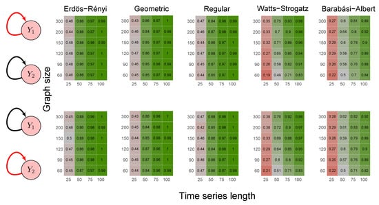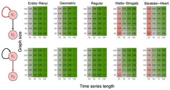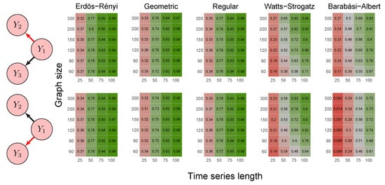 Heatmaps represent the proportion of rejected null hypotheses at a p-value threshold of 0.05. At the top, the direction of G-causality (direction of the edge) in Scenario 2. Each cell has varying colors from red to green representing the statistical power (proportion of rejected null hypotheses). The four columns of each heatmap correspond to the results obtained by varying the time series length . The six rows correspond to the results obtained by varying the sizes of the graphs (number of vertices) . The “greener” the heatmap is, the greater is the power of the test. In contrast, the “redder” it is, the lower is the proportion of rejected null hypotheses. We simulated five random graph models, namely Erdös–Rényi, geometric, regular, Watts–Strogatz, and Barabási–Albert. We do not show the heatmaps for Watts–Strogatz and Barabási–Albert random graph models because alterations in the parameter do not alter the degree.