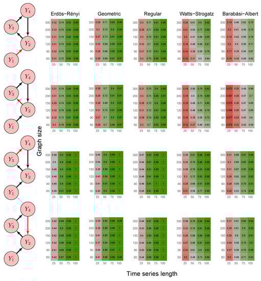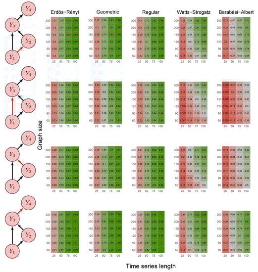 Heatmaps represent the proportion of rejected null hypotheses at a p-value threshold of 0.05. At the left, we show the direction of G-causality (direction of the edges) in Scenario 4. Heatmaps on the right side represent the proportion of rejected null hypotheses highlighted in red in the left schema. The four columns of each heatmap correspond to the results obtained by varying the time series length . The six rows correspond to the results obtained by varying the sizes of the graphs (number of vertices) . The “greener” the heatmap is, the greater is the power of the test. In contrast, the “redder” it is, the lower is the proportion of rejected null hypotheses. We simulated five random graph models, namely Erdös–Rényi, geometric, regular, Watts–Strogatz, and Barabási–Albert.