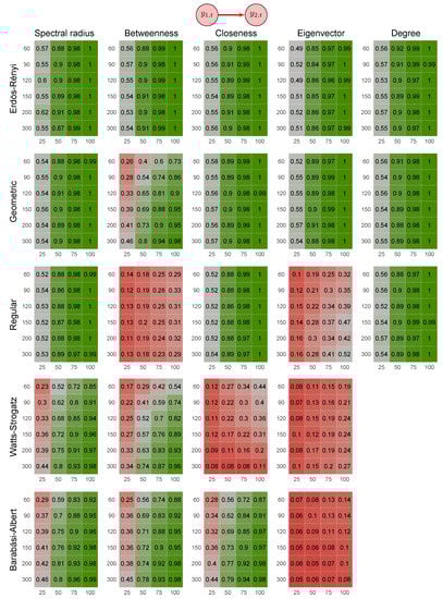 One may consider using another graph feature instead of the spectral radius, such as one of the centrality measures (e.g., betweenness, closeness, eigenvector, and degree). Thus, we repeated the analysis by using these other features. Figure 8 shows the heatmaps describing the results of these simulations. By analyzing Figure 8, we notice that the power of the proposed method based on the spectral radius was greater (or at least equivalent) than when based on other features.