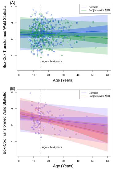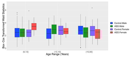 Figure 9 panels A and B show that children in ASD had a higher G-causality from the right to the left brain hemisphere than controls. This scenario changed at approximately 14 years old. Figure 10 shows the boxplots of the Box–Cox transformed Wald’s test statistic obtained by the VAR method, separated by age range, ASD diagnosis status, and gender. According to a Welch’s t-test, there was a differential G-causality from the right to the left hemisphere in autistic subjects considering only females aged 6 to 13 years () and considering only males aged 16 to 60 years ().