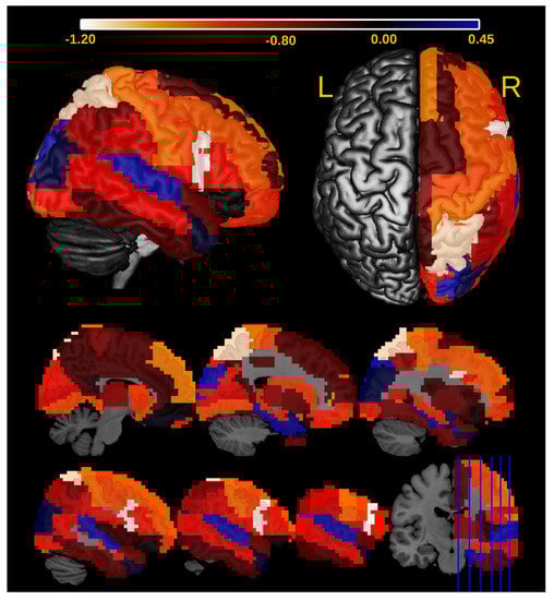 - Tzourio-Mazoyer, N.; Leau, B.; Papathanassiou, D.; Crivello, F.; Etard, O.; Delcroix, N.; Mazoyer, B.; Joliot, M. Automated Anatomical Labeling of Activations in SPM Using a Macroscopic Anatomical Parcellation of the MNI MRI Single-Subject Brain. Neuroimage 2002, 15, 273–289. [Google Scholar] [CrossRef]