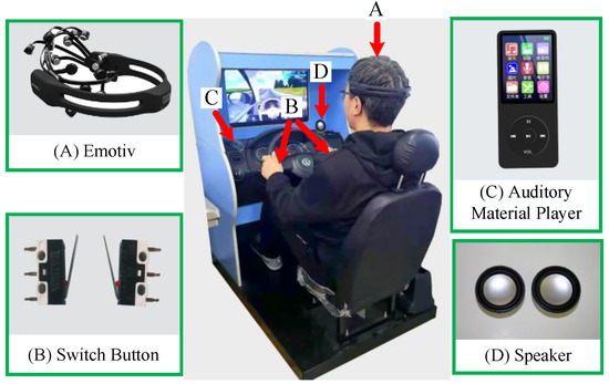 The Emotiv device was used to collect EEG data in this experiment. The sampling rate of the device was 128 Hz and the 14 electrodes were arranged according to the international 10–20 system (14 channels = AF3, AF4, F3, F4, FC5, FC6, F7, F8, T7, T8, P7, P8, O1, O2). The electrode caps were correctly attached to the subjects before the experiments were conducted, and the connection status of the 14 electrodes was checked at all times during the experiments to ensure the validity of the data. In addition, we ensured that the experiment environment was quiet to reduce noise disturbances. The equipment used for this experiment is shown in Figure 1.