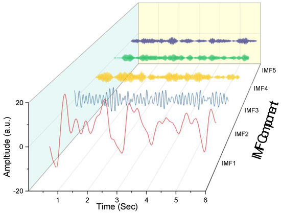 The VMD is a completely non-recursive time domain signal processing method. Figure 2 shows a time domain signal diagram, decomposed using the VMD from the first stage of the O1 channel, with the subject driving in normal driving mode.