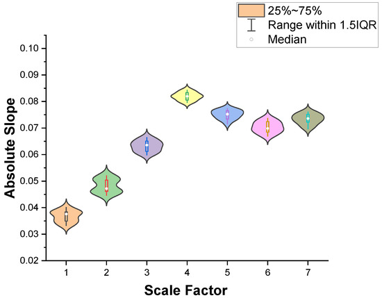 To analysis the influence of scale factors on EEG extraction in relation to driving fatigue features, we calculated the change trend of MMSE for IMF3 at scale factors 1–7 over seven driving stages. The fatigue feature change trends of the seven driving stages based on MMSE on a 1–7 scale were fitted using the LSM and then the obtained slopes were calculated in terms of absolute values. The distribution of the slopes’ absolute values for the 15 subjects under the seven scale factors is shown in Figure 4.