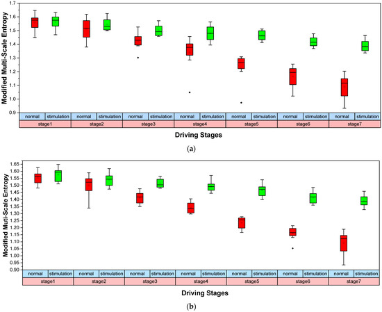 As can be seen in Figure 5, the MMSE of the O1 and O2 channels displayed significant downward trends with the extension of the driving time in normal driving mode, indicating a gradually deepening of driver fatigue. When the driver performs monotonous driving tasks for a long time in normal driving mode, the driver experiences an insufficient cognitive load, which easily leads to passive fatigue. With the extension of driving time, the driver’s reaction time in response to emergency situations becomes gradually longer, they become less alert, their perception of the outside world is weakened and their fatigue level gradually increases. The MMSE showed a slight downward trend with the extension of the driving time during interesting auditory stimulation, indicating that driver fatigue increased more slowly when driving tasks were performed. When exposed to interesting auditory stimulation, drivers were at their cognitive optimum and were not prone to passive fatigue. However, with the extension of driving time, drivers emerged slightly fatigued. As a result, the MMSE demonstrated a slight decrease during interesting auditory stimulation. Additionally, there was a significant difference between the two driving modes (O1: |t| = 5.138 > t0.05,15 = 2.131, p =1.64 × 10−5 < 0.05; O2: |t| = 6.47 > t0.05,15 = 2.131, p = 1.731 × 10−6 < 0.05). We also used one-way ANOVA to analyze the fatigue characteristics calculated based on MMSE for the two experiments. The results showed a significant difference between the two driving modes (O1: F = 4.78 > F(1,12) = 4.75, p = 0.0493 < 0.05; O2: F = 4.98 > F(1,12) = 4.75, p = 0.0455 < 0.05). Consequently, the interesting auditory stimulation method used in this paper can effectively relieve driving fatigue.