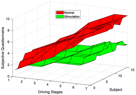 As can be seen in Figure 6, the questionnaire scores showed an upward trend when subjects were performing the two driving modes, indicating that the fatigue level gradually increased over the extension of he driving time. However, there was a significant difference between the two driving modes (|t| = 5.897 > t0.05,15 = 2.131, p = 2.41 × 10−6 < 0.05). In addition, we conducted one-way ANOVA on the KSS scores for the two types of experiments. The results showed a significant difference between the two types of experiments (F = 4.87 > F(1,12) = 4.75, p = 0.0475 < 0.05). Due to the influence of interesting auditory stimulation, drivers’ cognitive levels reached relatively optimum levels. Accordingly, drivers’ fatigue levels increased relatively slowly during the interesting auditory stimulation mode, compared to the normal driving mode, which indicated that the interesting auditory stimulation method used in this paper was effective for alleviating driving fatigue.
