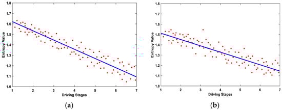 As can be seen in Table 1, the drivers’ age and gender had no significant influence on the degree of driving fatigue (p > 0.05). However, the driving time had a significant influence on the degree of driving fatigue (p < 0.05). Therefore, the LSM was used to linearly fit the driving time and entropy characteristics of subjects in this study. In order to verify the effectiveness of the VMD-MMSE method, based on the O1 channel EEG data in normal driving mode, the change trends of the fatigue characteristics, calculated using SampEn and the VMD-MMSE method, were fitted with the seven driving stages. The results are shown in Figure 7.