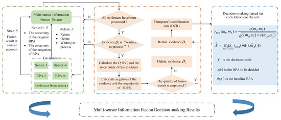 In this section, a novel evidence combination method is proposed for adapting conflict and making fusion decisions based on the uncertainty of evidence and RL. This method defines information fusion as a RL task, and builds a fusion model using RL and the uncertainty of original BPA and are calculated by the use of Deng entropy comprehensively. Firstly, considering that the negation of BPA is also an important way to express information, the uncertainty of original BPA and its negation. If we adopt the negation of BPA and the original BPA as the judgment conditions. Then the judgment conditions are diversified, which can help to obtain the correct processing results of different sensor information and realize effective conflict management. If we adopt the original BPA as the judgment condition. Then the judgment condition is single, which may cause inaccurate processing results of the sensor information. Thus, these two uncertainty degrees as the judgment conditions are used to distinguish the information quality of evidence, so that consistent evidence can be selected through RL. Next DCR is used to implement information fusion. Finally, the decision result is obtained through a decision-making scheme based on correlation coefficients. The overall information fusion and decision process of the proposed method is shown in Figure 1.