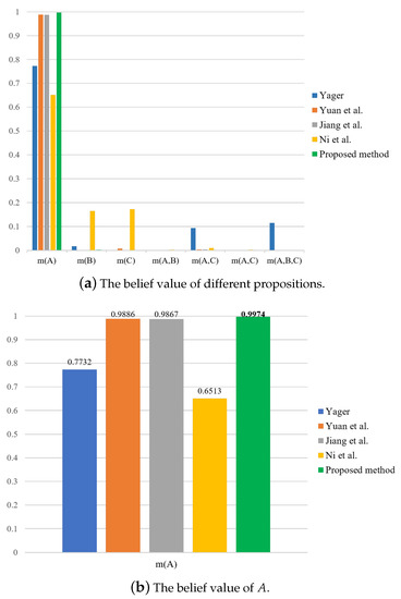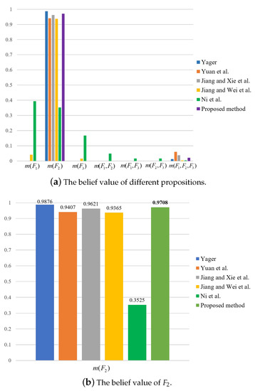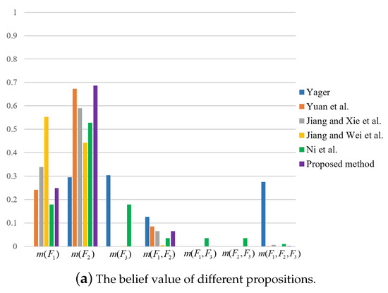 For the sake of comparison, results by the use of other methods are also obtained, as shown in Table 13 and Table 14 and Figure 3, Figure 4 and Figure 5. It can be seen from Table 13 and Table 14 that the proposed method has the highest mass or belief on the true fault type under each of the three features. This is because the proposed method can delete the conflicting evidence adaptively through RL, uncertainty degree of BPAs, and the negation of BPA, so as to avoid the impact of the conflicting evidence on the overall fusion accuracy. In addition, the proposed method can make full use of the sensor information to obtain the fusion results. By contrast, in the fusion result of Yager’s method is the largest under feature 3, which is inconsistent with the true fault type. As for Ni et al.’s method, the decision result is under feature 2, which is inconsistent with the true fault type. The other methods can identity the true fault type but the mass or belief of the result is lower than the proposed method.