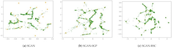 Figure 1 shows the qualitative results of SGAN, SGAN-0GP, and SGAN-RSC on the synthetic data. The ideal generation is to generate samples that cover every real sample and that every generated sample be close to the real samples. However, we note that the green generated samples did not cover part of the orange real samples in Figure 1a, which indicates that mode collapse occurred. In Figure 1b, although mode collapse did not occur, many generated samples were distributed far away from the real samples. The generation in Figure 1c was the best in the three subfigures. Not only was there no mode collapse, but there were fewer generated samples that were far away from the real samples. The consequence was consistent with Figure 2. Although the number of fake real samples in SGAN was low, mode collapse occurred. According to Figure 1 and Figure 2, the SGAN-RSC we proposed led to fewer fake real samples and generated samples that were far away from the real samples and avoided model collapse.
