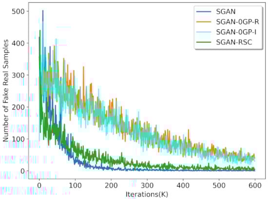 Result of the number of fake real samples in SGAN, SGAN-0GP, and SGAN-RSC with ResNet on CIFAR-10. We randomly sampled 1000 fake samples and counted the number of false samples. SGAN-0GP-R represents 0GP regularization on real samples; SGAN-0GP-I represents 0GP regularization on the linear interpolation between the real samples and the generated samples.