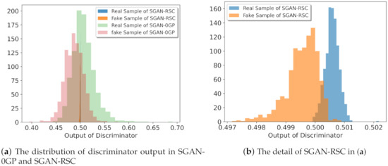 In order to alleviate the problem of fake real samples, we can increase and decrease . Assume that for , is a close pair for ∀. According to the definition of a close pair, we can approximate as , because according to the previous assumption of , we can obtain . Consider Equation (2); we have . This shows that although is a real sample, the discriminator’s output for is less than . Therefore, we propose Real Sample Consistency (RSC) regularization, which enforces the discriminator to output the same value for the real samples. Considering that the proportion of the discriminator’s output for real samples < is low and > is high, this alleviates the problem of the discriminator’s output for real samples by enforcing the discriminator to output the same value for the real samples. The discriminator in SGAN-RSC maximizes:
