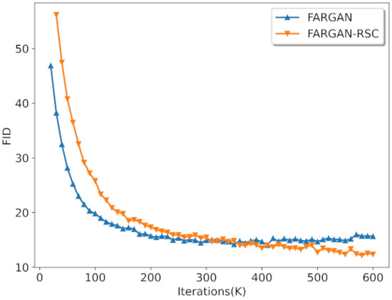 The result on FARGAN and FARGAN-RSC on CIFAR-10 is shown in Figure 4. FARGAN-RSC outperformed FARGAN. Note that the FID of FARGAN dropped quickly at the beginning of training. However, as the training progressed, the FID of FARGAN was surpassed by the FID of FARGAN-RSC, and the FID of FARGAN-RSC continued to decrease.