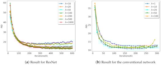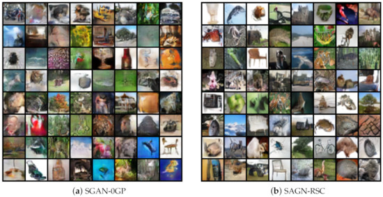 In order to obtain the optimal parameter , we selected parameter through ablation experiments, as shown in Figure 5. Figure 5a shows that, when , SGAN-RSC with ResNet achieved better results with the increase of . However, when we set , the result was worse than that of . Consequently, we set for SGAN-RSC with ResNet. Similarly, we set for SGAN-RSC with the conventional network.