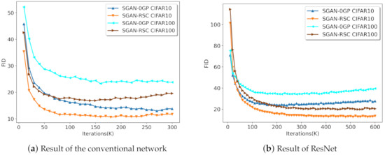 To verify the effectiveness of our proposed real sample consistency regularization with different network architectures, we compared SGAN-0GP and SGAN-RSC with the conventional network and ResNet, respectively. Experiments were carried out on CIFAR-10 and CIFAR-100. The result is shown in Figure 6. In all experiments, SGAN-RSC outperformed SGAN-0GP, especially with ResNet. Note that although the FID value of SGAN-RSC with the conventional architecture on CIFAR-100 increased slowly in the late training period, and the lowest FID value of SGAN-RSC with the conventional architecture on CIFAR-100 was lower than that of SGAN-0GP with the conventional architecture on CIFAR-100. Figure 6 shows that our method was effective for different network architectures.
