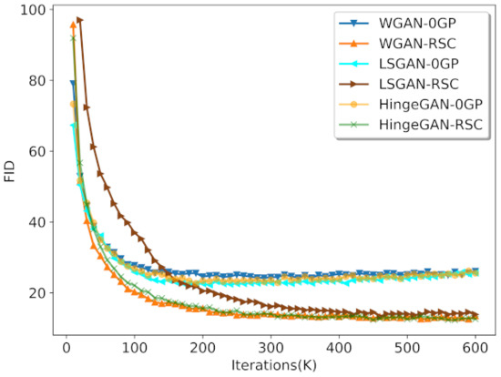We also experimented with different GAN variants. In our experiments, 0GP on real samples instead of 1GP was applied in WGAN [16,17,31]. We set for LSGAN [19] and , and for FARGAN [15]. The result is shown in Figure 7. Note that real sample consistency regularization outperformed 0GP regularization for all GAN variants. Although LSGAN-RSC converged slowly in the early stages of training, it eventually reached an FID value similar to that obtained by other GAN variants with real sample consistency regularization. Figure 7 shows that our method was effective for different GAN variants.