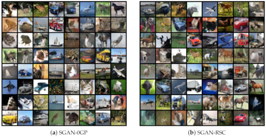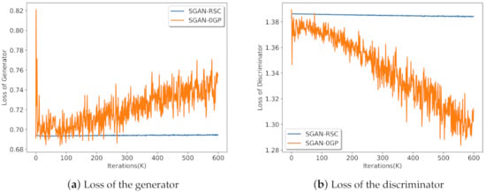The loss of the generator and discriminator with ResNet on CIFAR-10 is shown in Figure 8. The theoretical loss was for the generator and for the discriminator. As the training progressed, we observed that the loss of the generator increased, and the loss of discriminator decreased significantly in SGAN-0GP. However, the loss of the generator and discriminator in SGAN-RSC was close to the theoretical loss and kept stable. Figure 8 shows that our method can stabilize the training of SGAN-0GP.