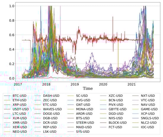 Figure 1 presents the evolution of prices from 2017 when the cryptocurrency was growing to the recent pandemic. To compare the similarity patterns of the data, we scaled the prices of all markets equally between 0 and 1. As you can see, the dynamics of the market appear differently according to each period. In terms of trend, overall prices rose sharply in 2017 and 2018, and although there was often a move to increase in 2019 and 2020, it was limited by COVID-19. The trend of the cryptocurrency market shows that prices rose sharply in 2017 and 2018, followed by a stagnant move until the recent COVID-19. Again from 2020, prices are rising sharply with COVID-19. Therefore, it is necessary to explore the complexity of the cryptocurrency market through the entropy evolution in order to understand the rapid fluctuations from the past with small economic risks to the COVID-19 pandemic.