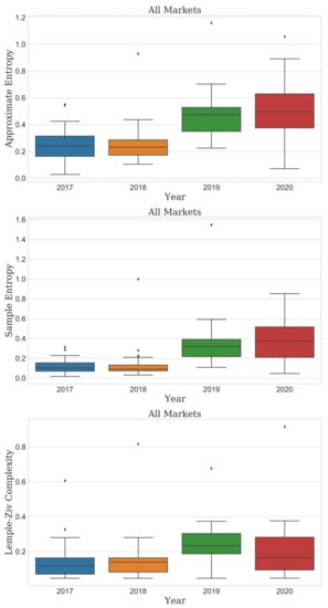 Boxplots of the ApEn, SampEn, and LZ for the cryptocurrency markets from the bull to current COVID-19 pandemic. Each year includes 43 markets. Diamond symbols are outliers.