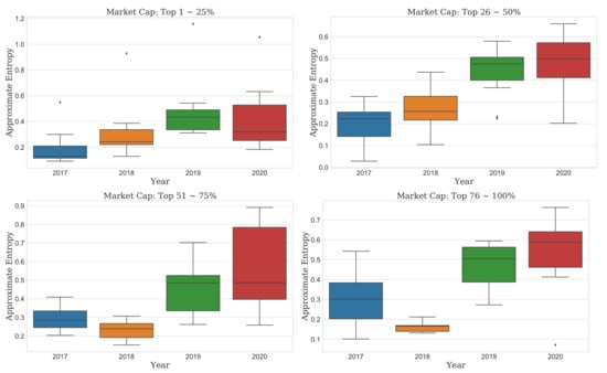 First, the distribution of ApEn in all cryptocurrency markets decreased from 2017 to 2018 on a 75% quantile basis, but it continuously increased until the current COVID-19 pandemic year (top of Figure 2). However, in market cap the top “1–50%”, the complexity has been continuously increasing from 2017 to 2020, and we observed no particular decrease. It also was confirmed that the complexity/unpredictability of the cryptocurrencies with a market cap of “51–100%” was very low in 2018 compared to other years. The distribution of ApEn has significantly increased in 2019 and 2020 during the COVID-19 pandemic compared to 2017 and 2018). Furthermore, in particular, it shows that complexity/unpredictability increased more in 2020 than in 2019 in each market cap result. In 2020, the complexity of the “51–75%” market cap has the widest range of IQR, so it shows that cryptocurrency with a very diverse complexity is distributed due to the COVID-19 pandemic in market cap being the top “51–75%”. (bottom left of Figure 3).