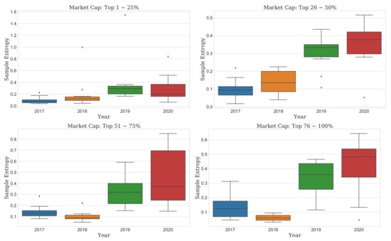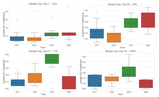 The cryptocurrencies with a market cap of the top “1–25%” showed little difference in LZ complexity by year. The cryptocurrencies in the top “26–50%” have the lowest LZ complexity value in 2018 but show an increasing trend from 2017 to 2020. However, in the top “51–100%” of cryptocurrencies, the LZ complexity increased significantly in 2019, and the result in 2020 is similar to 2017 and 2018 again. Therefore, the COVID-19 pandemic affected the entire market, especially the cryptocurrencies with a market cap of the top “51–100%” (Figure 5). However, we should still consider the effect of the current health crisis on each market cap, given the increasing complexity. Among the market caps, the top “26–50%” group had the highest range, so this market cap seems to have been most affected by the COVID-19 pandemic.