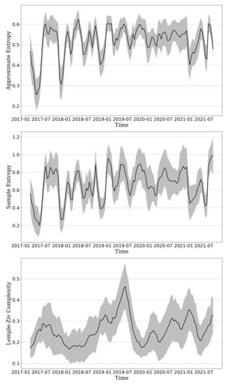 Time evolution of ApEn, SampEn, and LZ. The black line is the average value of 43 cryptocurrencies in market, and the gray shade is the 95% confidence interval.