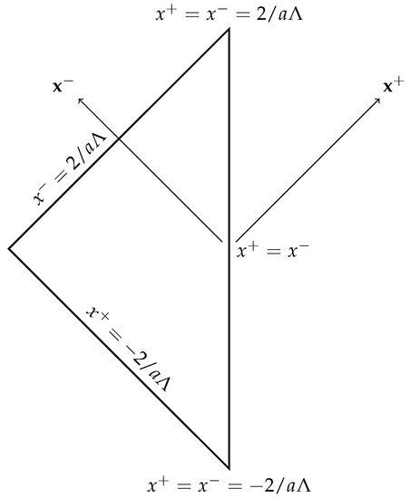 , and represent, respectively, a space-time with a positive ADM mass, with Killing horizon at , the AdS vacuum (zero ADM mass) and a space-time with a negative ADM mass. Adopting the nomenclature of [43], we will refer to these as AdS (), AdS () and AdS (). These three solutions represent different parameterizations, covering different regions of the same manifold, as they are connected with each other by coordinate transformations. This means that the local properties of the space-time described by the metric (3) are the same, independently from the value of . Therefore, the three space-times can be maximally extended to obtain full AdS, which has no horizon and is geodesically complete. Nevertheless, AdS can be interpreted as a 2D black hole with an event horizon at , if one takes into account the physical meaning of the dilaton as the (coordinate-dependent) inverse 2D Newton constant, demanding . This requirement implies the existence of a space-time singularity at , where the 2D Newton constant diverges. The line has to be considered as an inner boundary of the space-time, whose existence allows one to consider AdS as a black hole, AdS as a space-time containing naked singularities and AdS as the ground state, zero mass solution [43] (a similar conclusion can be reached if one considers the JT model as originated from spherical dimensional reduction of 3D Bañados–Teitelboim–Zanelli (BTZ) [62] or higher dimensional [43] black holes. In this case, the positivity condition is required by the identification of with the radius of the compactified sphere).