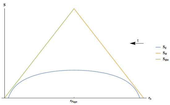 These nice features allow describing analytically the behavior of the entropy of both the black hole and the radiation and, consequently, to reconstruct the Page curve. In [37], for example, this is done by using the holographic entropy formula [33,46,47] and the entanglement wedge reconstruction idea, for a JT black hole coupled with a CFT matter sector with a higher-dimensional holographic dual. In particular, the latter allows connecting the interior of the black hole with the radiation subsystem, in the spirit of the “Einstein–Podolsky = Einstein–Podolsky–Rosen” (ER = EPR) conjecture [48,49,50]. The same technique is applied in [51] to derive the Page curve in the 2D Callan–Giddings–Harvey–Strominger (CGHS) model [52,53]. Finally, in [54], the Page curve for JT black holes is derived by considering the 2D gravitational model as the dimensional reduction of the 3D AdS gravity.