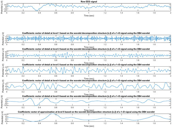 The wavelet analysis (decomposition) of the EEG signal was performed through the wavedec [37] function implemented in MATLAB which returns the wavelet decomposition of the 1-D signal x(t) of every ith channel (with i = 1, 2, …, 19) of every th epoch (with = 1, 2, …, 214) of every mth patient (with m = 1, 2, …, 36)) at level n (with n = 1, 2, …, 5) of details () and 5 of approximation () using the Daubechies 4 (DB4) wavelet. Other mother wavelets can be used, as appropriate for experimental biosignals [38]. The output decomposition structure consists of the wavelet decomposition vector c and the bookkeeping vector l, which contains the number of coefficients by level. Subsequently, using the wrcoef [39] function, also integrated in MATLAB, the coefficients vector of type based on the wavelet decomposition structure [c,l] of a 1-D signal (wavedec) using the wavelet DB4 was reconstructed (Figure 3).