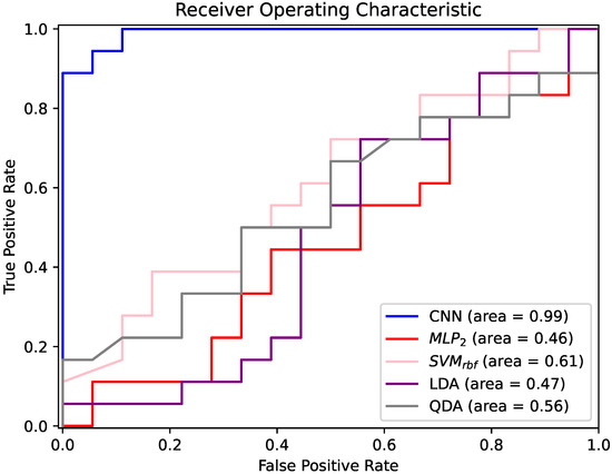 The proposed CNN was also compared with standard classifiers to evaluate the specific efficiency of the DL approach. In detail, the multi-layer percerptron (MLP), support vector machine with a Gaussian radial basis function kernel (), linear discriminant analysis (LDA) and quadratic discriminant analysis (QDA) were trained on handcrafted features extracted from wavelet sub-bands. Specifically, for each epoch of the mth patient (m = 1, 2 …, 36), six characteristics discriminating from the six EEG signal sub-bands were calculated: Min, Max, Energy, Mean, Std and Skewness. The last three features (Mean, Std and Skewness) were chosen in agreement with Gasparini et al. [47]. Additional information was obtained including Min, Max and Energy, according to Hamad et al. [33].