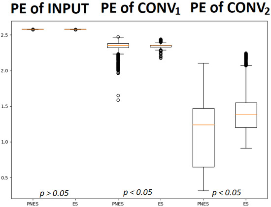 The box plots describe the permutation entropy distribution of the class of subjects with PNES and ES referred to input layer (1st and 2nd box plots), layer (3rd and 4th box plots) and layer (5th and 6th box plots). It is worth noting that the PE of input did not allow significant discrimination between the two classes. Instead, statistically quantified differences, with a p-value < 0.05, were found between the PE of PNES and ES subject in and .