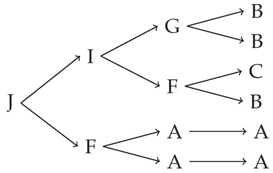 Figure 1. An example of the operation of the discrete jet generator. The mother particle J decays into particles I and F. According to decay probabilities, this happens in half the generated jets. The daughter particles subsequently decay two more times, leaving only stable, detectable particles in the final state.