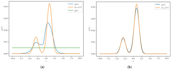 Figure 3. Both panels: The calculated probability density p calculated ( x ) (blue line) compared to the real probability density p real (x) (orange line). (a) The left panel shows the comparison after one iteration of the algorithm, alongside the starting “test” distribution (green line). (b) The right panel shows the comparison after the 5th iteration. In this panel we omit the starting distribution (green line) to more clearly show the comparison of the calculated and the real distributions.