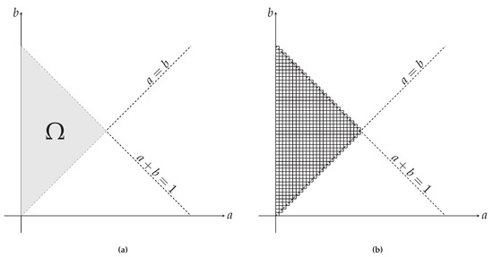 needs to be calculated. Here, Ω denotes the entire probability space and is shown as the gray area in the left panel of Figure 4. To calculate the integral in the above expression, the probability space is discretized into 650 equal areas shown in the right panel of Figure 4. These areas are obtained by discretizing the parameters a and b into equidistant segments of length 0.02. After the discretization, the partition function Z ( M ) then becomes