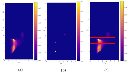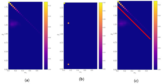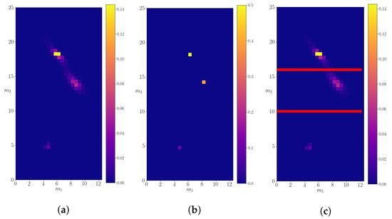 Figure 6. The calculated probability density for a decaying particle of mass M = 25.0 . (a) The left panel shows the density evaluated on the entire discretized probability space. (b) The probability density of “real” data. (c) A division of the probability space into three subspaces, in order to isolate particular decays.