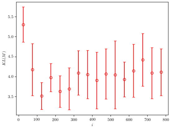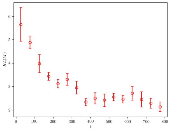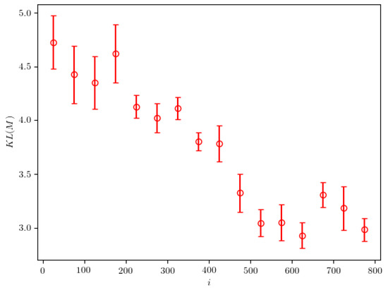 Figure 11. KL divergence between calculated and real probability density evaluated for the M = 14.2 . Results are averaged over the intervals of 50 iteration. Error bars represent standard deviation on the same interval.