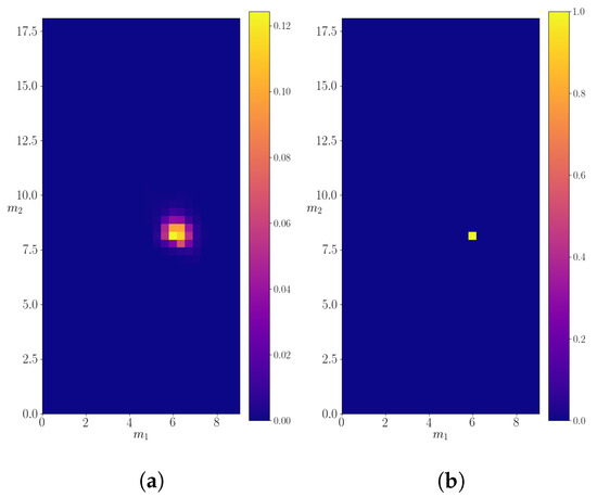 Unfortunately, we cannot explicitly obtain the probability p ( m 1 , m 2 M ) directly from Equation (19) without solving a linear system of equations. This task proves to be computationally exceptionally challenging due to the high dimensionality of the dataset. In order to avoid this obstacle, we introduce a neural network f to approximate ln p ( m 1 , m 2 | M ) . We can optimize this neural network by minimizing the mean squared error applied to the two sides of Equation (19).