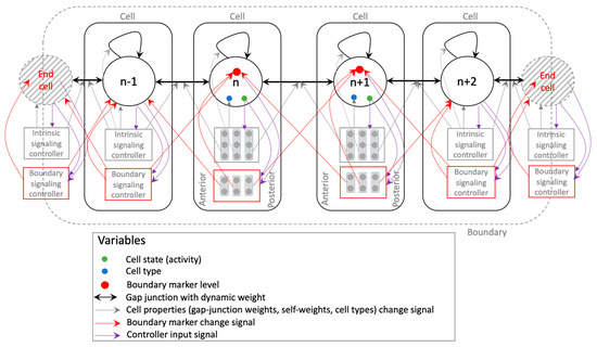 Schematic of the model of axial pattern development. The model comprises of a finite linear chain of cells (a total of 12 cells comprise the model used in this work). We hypothesize that the following elements will be sufficient to implement emergent axial patterning. Every cell has two kinds of signaling networks, one that determines the properties of the cell, namely the cell type and the gap-junction weights, and the other that signals to the cell the extent to which it lies at the boundary. These two factors are expected to act in concert in simultaneously detecting the boundaries and developing a gradient-like phenotypic pattern within the detected boundaries where the pattern would be expected to taper off. The intrinsic controller is a 3 × 3 lattice (totaling 9 nodes), and the boundary controller is a 2 × 3 lattice (totaling 6 nodes), depicted as part of the representative cells and in the middle. As the connections indicate, the anterior and posterior (1st and 3rd) columns of the intrinsic controller influence the anterior and posterior gap-junction weights respectively, and the central column influences the cell’s self-weight. In the same way, the most anterior and posterior (1st and 3rd) columns of the boundary controller signal to the anterior and posterior cells, respectively. Finally, in each cell, the cell state influences all the nodes of either controller, the cell type is influenced by all of the intrinsic controller nodes, and all of the boundary controller nodes are influenced by the cell’s own boundary-marker level.