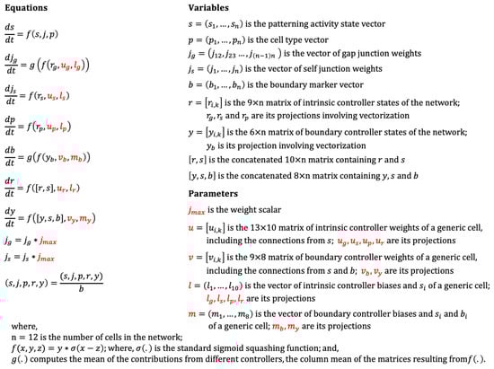 Formal definition of the model. All variables and parameters are continuous in that they can in principle assume any value on the real number line. The parameters (red) are trained and thus fixed during simulations. All variables are scaled by the boundary marker level , except itself, representing its dampening effect (akin to a time constant)—the greater the value of (the greater the cell tends to be a boundary cell), the more dampened its overall activity, including the patterning state, cell properties and internal controller states, is. Subscripted parameters and variables denote unique projections of the corresponding parameters and variables that can be inferred from the connectivity diagram shown in Figure 2. In cases where the value of a variable is determined by inputs from multiple controllers, such as the gap-junctions and the boundary-markers, the averaging operator computes the means of those contributions. The case of gap-junction weight updates exemplifies these concepts. The weight of every gap-junction is determined by the intrinsic controllers of cells and , specifically by the posterior column in the controller of the anterior cell and the anterior column of the posterior cell. Accordingly, the dimension of would be , where the dimensions represents the three nodes each of the two controller columns. This would then be partially vectorized, with the two columns contributing to each gap-junction concatenated into one, yielding a matrix with dimensions . In the same way, the dimension of would be , representing the two gap-junctions each contributed to by one column of the generic cell’s intrinsic controller totaling six nodes (three nodes per column). Thus, the multiplication of with yields a matrix of dimensions . Finally, the averaging operator computes the column-wise mean of the previous matrix resulting in a vector of updates to all the gap-junctions.