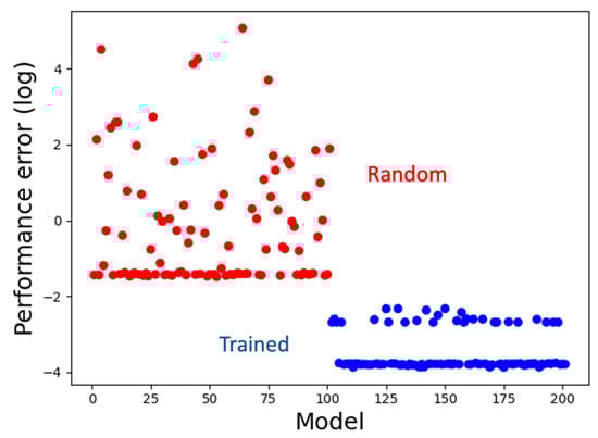 Training performance. Models trained using machine-learning have low performance errors (blue) compared to the random models (red). The line of blue dots at the bottom comprises the set of top-performing models (72% of the trained models) with similar scores.