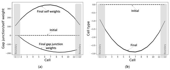 Cellular properties of the best-performing model. When initialized from homogeneous conditions and run for 4000 time-steps, the (a) intercellular gap-junction weights and the self-weights and (b) the cell types converge to characteristic shapes (black). Note that the model has eleven gap-junctions connecting the twelve cells in a chain, and every cell has a self-weight and a cell type.