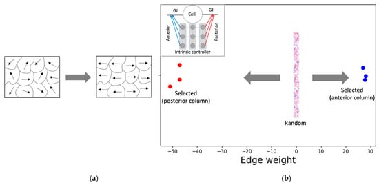 The PCP-like structure of a single cell (Figure 7) is an important factor that contributes to both the formation of the network-level GJ weights (Figure 6a) and the activity pattern (Figure 5a). This PCP feature is reflected in the organization of the intrinsic controller, discovered by machine-learning, with positive weights of the anterior column and negative weights of the posterior column that, respectively, control the left and right GJs of the cell (Figure 7b). This symmetry-breaking phenomenon manifests in biology in a variety of equivalent ways on an ontogenetic timescale [73] and could be considered analogous to the reorganization of magnetic domains in ferromagnetic materials due to the application of external forces (Figure 7a).
