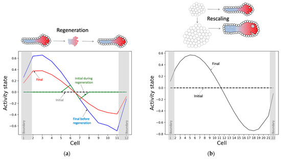 Rescaling the model (double the number of cells) rescales the corresponding causal network attractor underlying the network-activity pattern. The (a) causal network attractor and (b) its schematized version following rescaling of the model and simulating it with homogeneous initial conditions. The causal network attractor following regeneration is not shown, as it looks identical to the original (Figure 13).