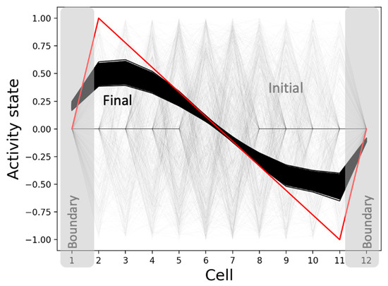 The pattern attractor-space of the activity state. The model converges to patterns (black) that are qualitatively similar to the target pattern (red) when started from a set of 1000 random initial conditions (grey). The initial conditions specifically involved a randomized initial number of ‘active’ cells whose activity states were drawn from the interval [−1, 1] and boundary-marker states from the interval [1, 2] with uniform probabilities. In the case of the ‘non-active’ cells, the activity states were set to 0 and the boundary-marker states were set to 2. The internal controller states were set to 0 in both cases.