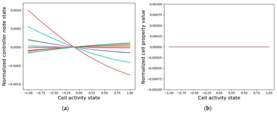 The intrinsic controller nodes’ activities simultaneously resemble the cell-properties and the network-activity patterns. Each line in the plot represents the asymptotic activity of a particular controller node across the network. That is, each line represents (a) the vector ( for a particular controller node and (b) its cell-normalized version where .