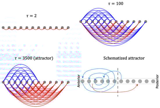 One of the emergent abilities of the model is to canalize random initial states (not seen during training) to similar pattern attractors (Figure 9). The reason is that the underlying causal networks corresponding to each of those random initial conditions themselves canalize into a mean attractor causal network whose overall features match those that corresponds to the homogenous case described above. For instance, the mean causal network attractor underlying network activity patterning (Figure 15) is characterized by the same anterior-positive and posterior-negative influences as the homogeneous case (Figure 13). The reason why the causal networks themselves canalize would involve investigations that are beyond the scope of this paper.
